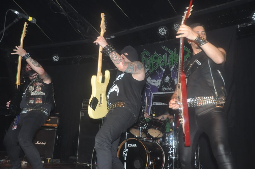 Depois dessa porrada sonora, veio não menos outra pancada, Apokalyptic Raids, capitaneado por outro batalhador, Leon Mansur, já conhecido por seu carisma e som rodeado da sonoridade dos pioneiros do estilo (Hell Hammer e Celtic Frost), que executaram um show bem pesado apesar de na segunda música apresentar problemas no som da guitarra (que perderam alguns minutos com problema aleatório de algum dos pedais e tiveram que retirar do set list a última música: “I´m a Metalhead”). A banda é composta por Leon Mansur “Necronomiac” (guitarra&vocal), Pedro Rocha “Skullkrucher” (bateria, que também faz parte da banda Whipstrike) e Armando “Exekutor” (baixo, que faz guitarra&voz também no Flagelador). Esse trio é sensacional e já fez inúmeras turnês internacionais, tendo um vasto público fiel e seguidor por onde vão tocar, principalmente no “Hell de Janeiro”. Quem ama as tais bandas suiças, com certeza já conhece a vasta discografia desses cariocas. O metal extremo brasileiro, cada vez mais se consolida como um dos melhores do planeta! Go to Hell!